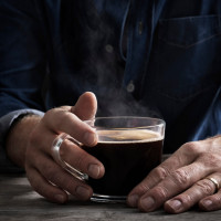 a hot beverage that could be coffee or tea, as indicated by the visible steam rising from it. The person seems to be enjoying this drink, as they are holding the cup with both hands and looking down at it.
