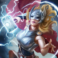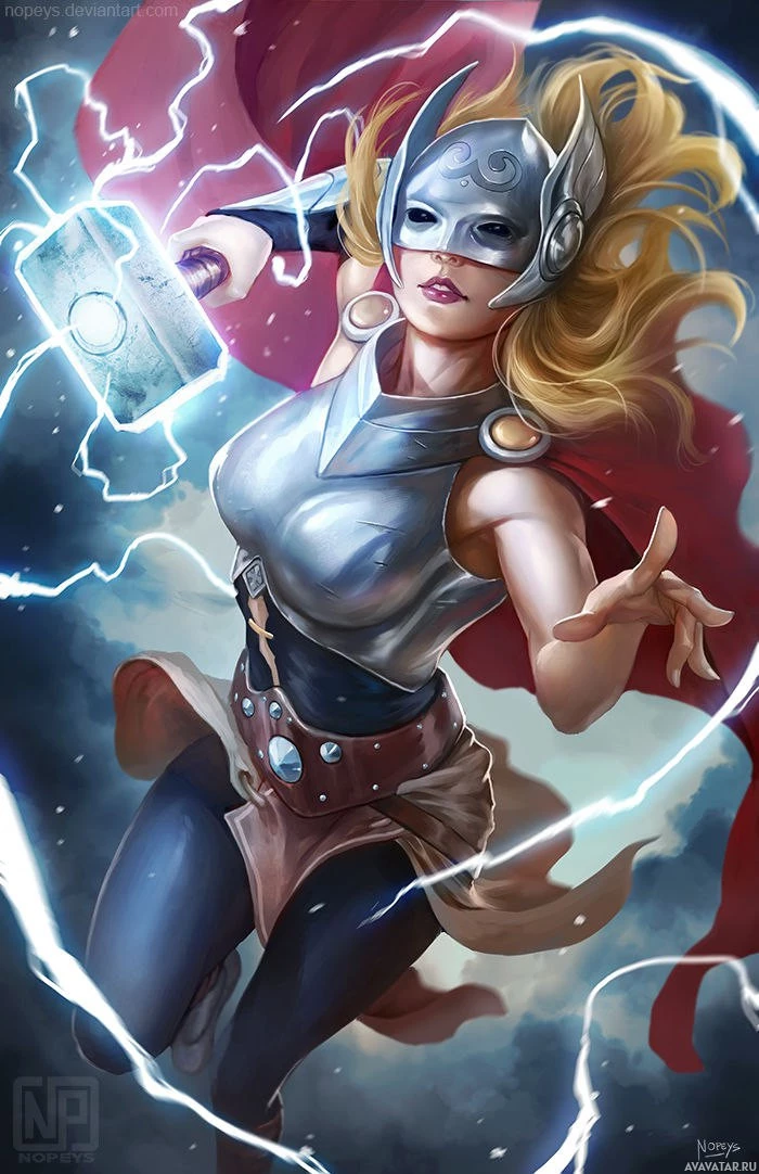 a female character, wielding Mjolnir (Thor's hammer) and ready to strike with lightning crackling around her. Her outfit includes elements reminiscent of Thor's
