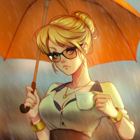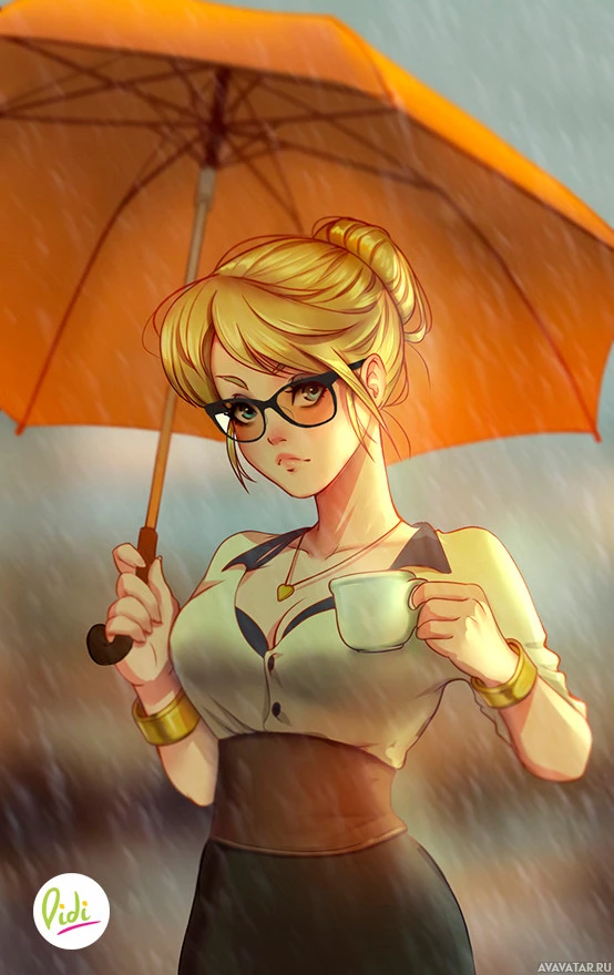 a rainy day as indicated by the rain droplets visible near her. In one hand, she holds a cup that looks like it could contain coffee or tea. The overall atmosphere of the image suggests a calm,