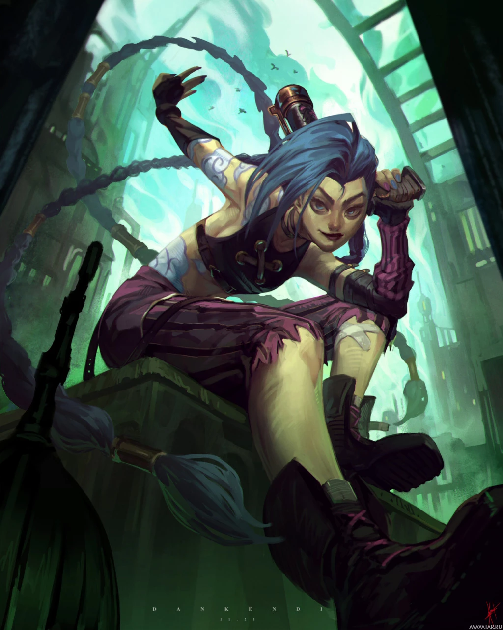 the video game "League of Legends." This character is known as Jinx. She has a distinctive appearance with