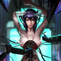 an animated character with purple hair and a cyberpunk theme. She appears to be a robot or cyborg, possibly from the "Ghost in the Shell" series, which is known for its exploration of cyber-enhanced humans and