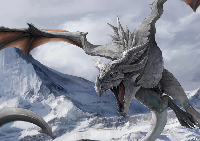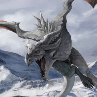 sharp teeth, and majestic presence as it soars through a landscape that appears to be part of an icy or snowy environment, possibly near mountains or a glacier. The artwork conveys the mythical and imaginative nature typically associated with