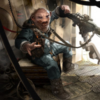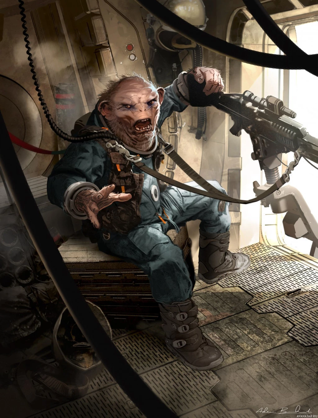 a fantasy scene featuring a character that appears to be a mutant or an alien. This creature is seated inside what looks like the cockpit of a spacecraft, holding onto the controls with its
