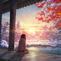 a tranquil scene with a girl sitting on a wooden deck during what appears to be either sunrise or sunset, given the warm lighting. She is facing away from the viewer, looking out at a calm