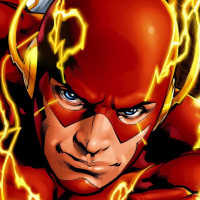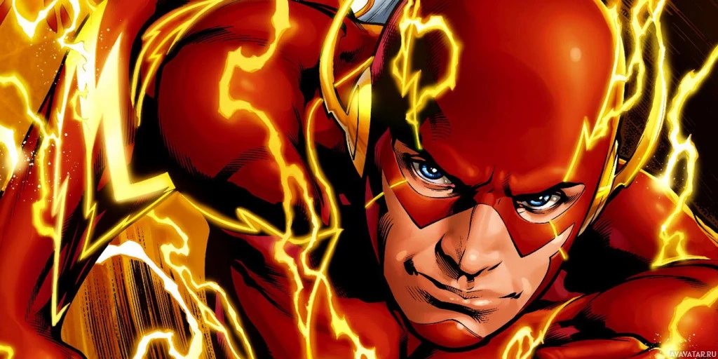 book lore. He is depicted with his iconic red and yellow suit, complete with lightning bolts and a mask that obscures his face. The character's pose suggests movement and speed, which are integral aspects of his