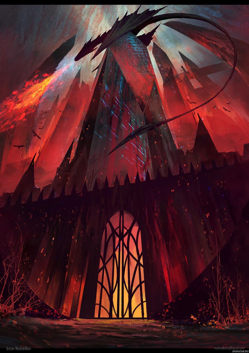 the flames at the base of the castle or possibly from a fire within. This artwork suggests a scene from