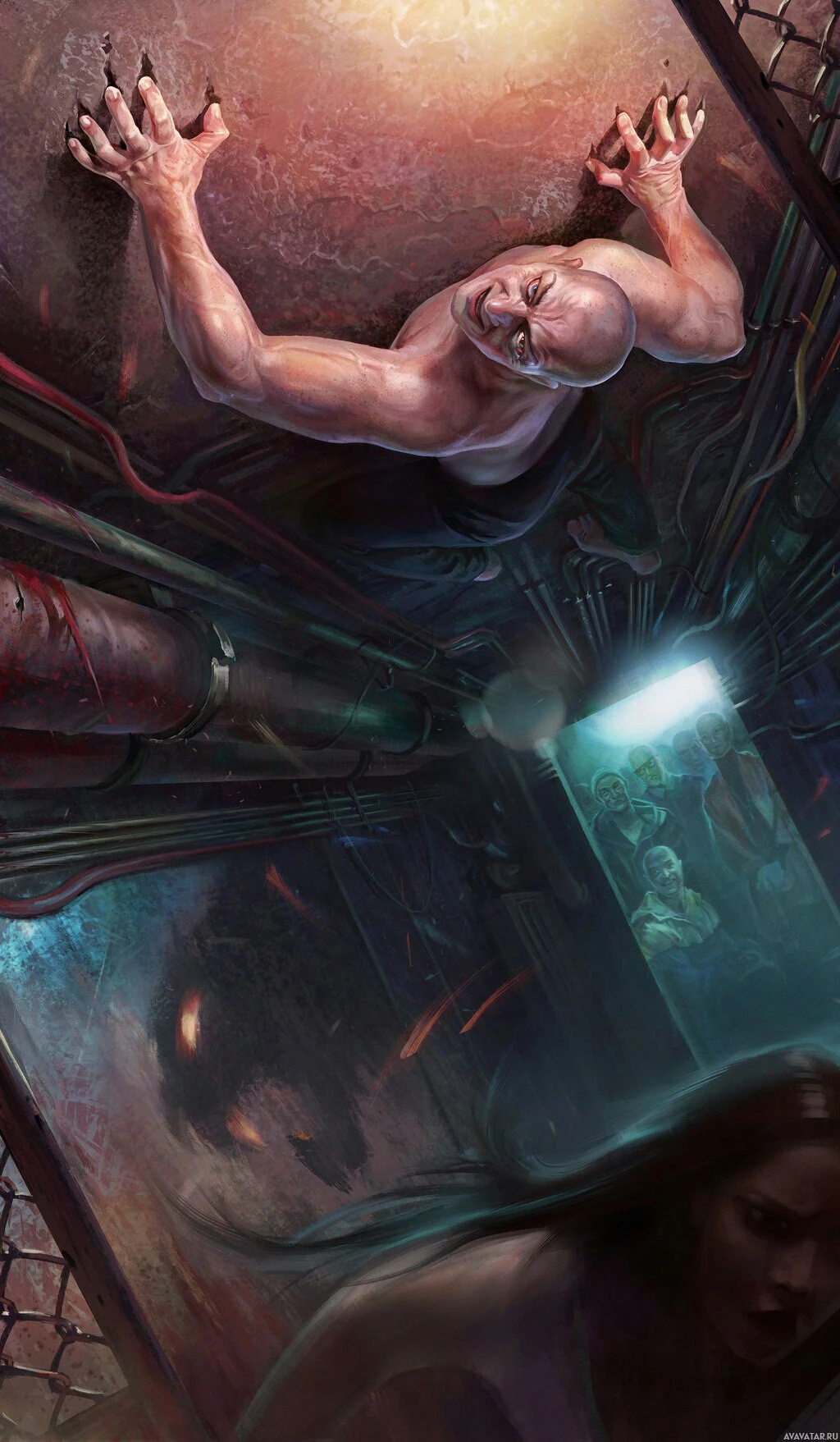 The image is a piece of illustrated artwork. It depicts two characters, one male and one female, in an intense scene that appears to be from a movie or book involving