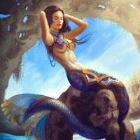 intricate patterns on her skin and wears a decorative garment that adds to her mythical appearance.
