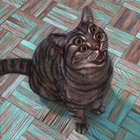 drawing of a cat. It appears to be standing on an uneven surface, possibly tiles or wooden planks, with its
