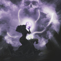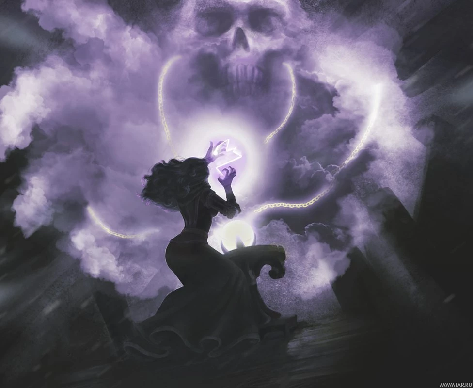 purple energy and seems to be in a magical trance or incantation. Above them, there's an illustration of a skull with