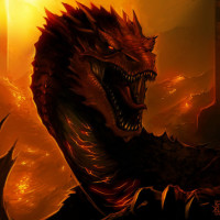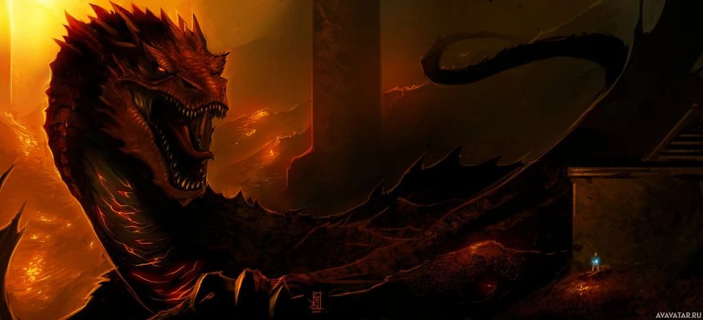 a menacing expression, conveying a sense of danger and power. It's set against a backdrop that looks like a volcanic or fiery landscape, with lava and smoke. This kind of image would be fitting for a story set in the world created by J.R.R. Tolkien, where dragons are known to exist and play