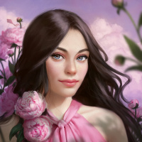 a young woman with long dark hair and blue eyes. She is depicted wearing a pink garment that could be described as