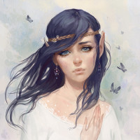 purple hair. The character is shown in profile, looking thoughtful or perhaps sad. They have pointed ears and are adorned with what appears to be a tiara or headpiece, which adds to their ethereal appearance. There's a soft, dreamy quality to the artwork with subtle blues and greens that evoke