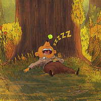 a natural setting. The character is surrounded by trees and foliage that suggest