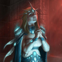 blonde hair and is wearing what appears to be a costume or armor with intricate designs, suggesting she may be from a fantasy setting or game. The character is shown kneeling down on one knee, with her hands clasped together as if in prayer or contemplation. Next to her is