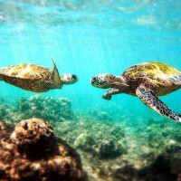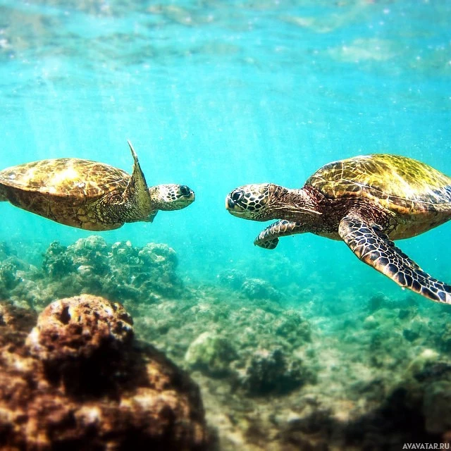 На снимке изображены две морские черепахи в их естественной среде обитания под водой. Они, по-видимому, участвуют в социальном поведении, возможно, приветствуя друг друга или игриво взаимодействуя. Окружающая среда характеризуется прозрачными голубыми водами с коралловыми рифами, видимыми вблизи поверхности.