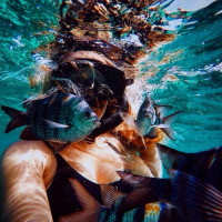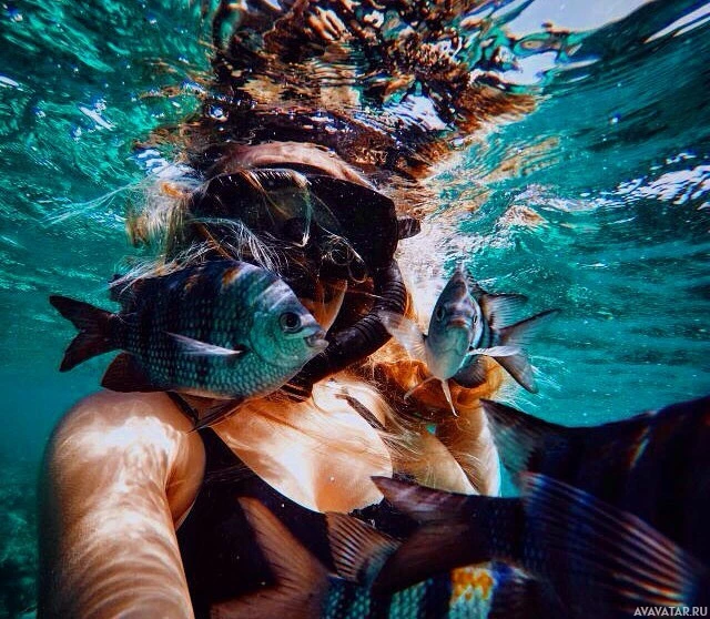 blue ocean water. They are holding onto fish with their hands while the camera is positioned underwater facing them, capturing a selfie from this unique perspective. This scene suggests an interaction between humans and