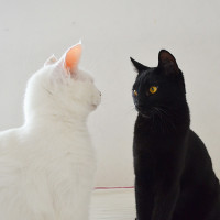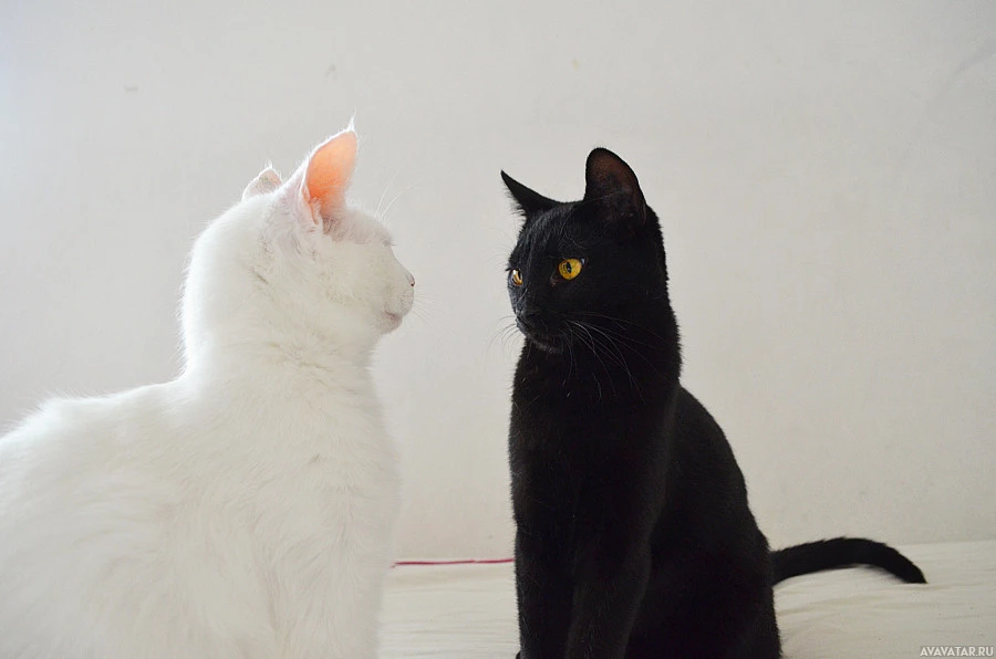 На картинке изображена белая кошка и черная кошка, обращенные друг к другу. Кошки, по-видимому, находятся в помещении с нейтральным фоном, что указывает на внутреннюю обстановку. Контраст между цветами двух кошек довольно поразителен и служит основным визуальным фокусом этой картины.