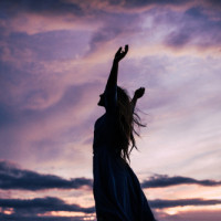 In the image, there is a silhouette of a person with their arms raised in the air. The individual appears to be outdoors at twilight or early evening, as indicated by the soft lighting and the colors in the sky. It looks like a moment of joy or celebration. There is no specific information about the location or any other identifiable features in the photo.