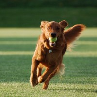 The image shows a dog, specifically a golden-colored retriever breed, running on grass with an open mouth, appearing to be playing with or chasing after what appears to be a tennis ball.