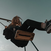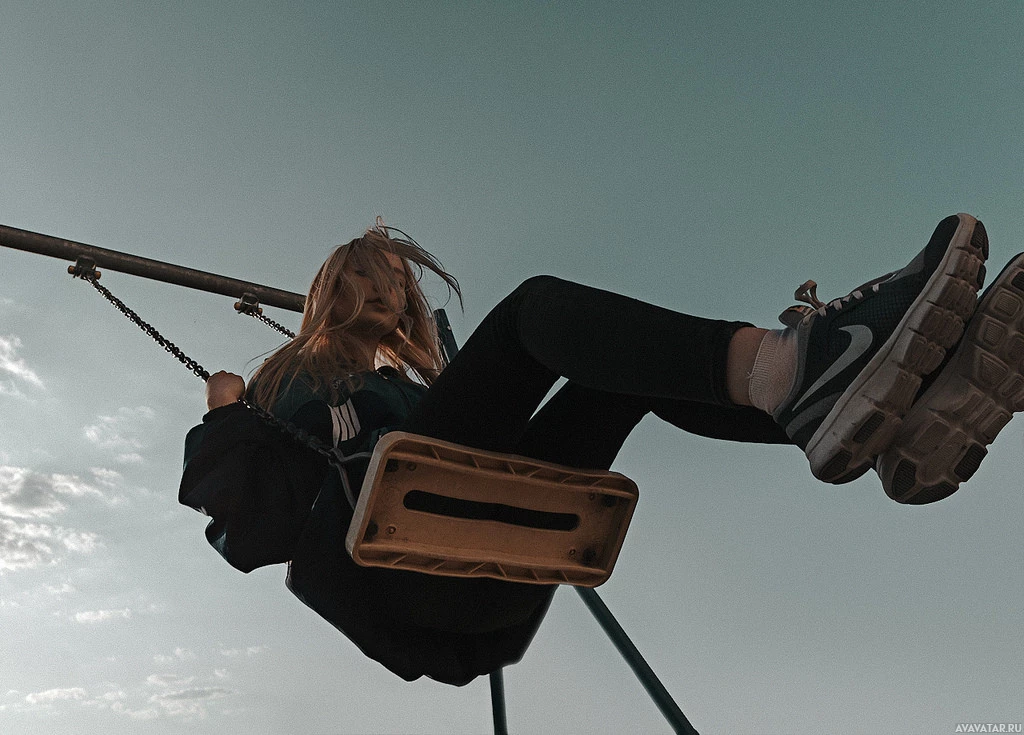 На картинке изображена молодая женщина со светлыми волосами. Она, кажется, наслаждается своим временем на качелях, которые включают в себя качающееся сиденье и горизонтальную планку для отталкивания. Небо на заднем плане предполагает, что это может быть ясный день.