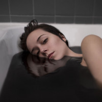 The image shows a woman lying in what appears to be a bathtub filled with water. She is looking upwards and has