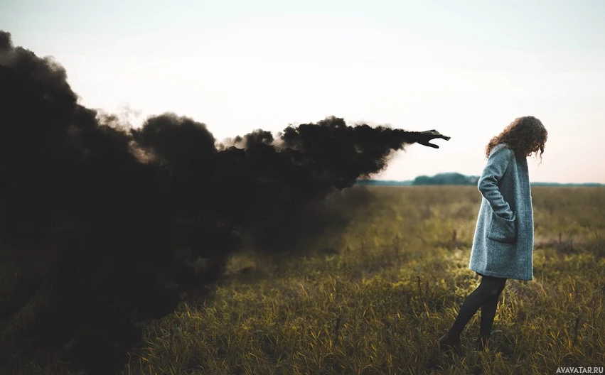 На снимке изображена девушка, уходящая от большого шлейфа черного дыма. Похоже, что это драматическая сцена, возможно, установленная в сумерках или на рассвете, учитывая мягкое освещение. Сеттинг выглядит как природная среда с травянистыми полями и туманным небом на заднем плане. Существует чувство срочности или беспокойства, которое выражается в позе девушки и темном присутствии дыма.