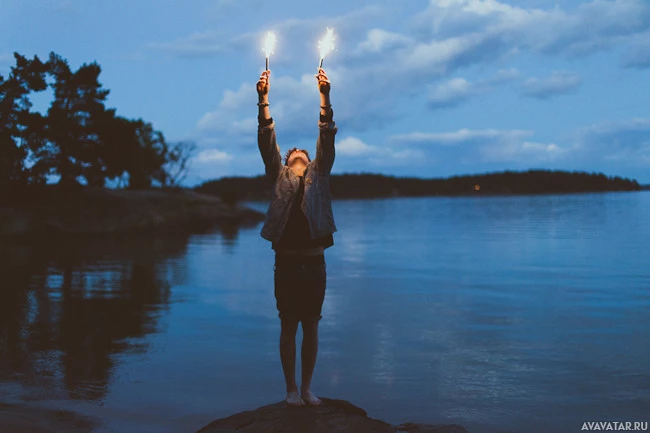 lit candles, which are likely creating a warm and soft glow around them. The person is looking upwards, possibly towards the sky or