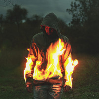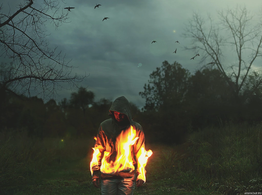 the eerie atmosphere of the image. The use of fire as part of the composition suggests a theme of warmth or perhaps