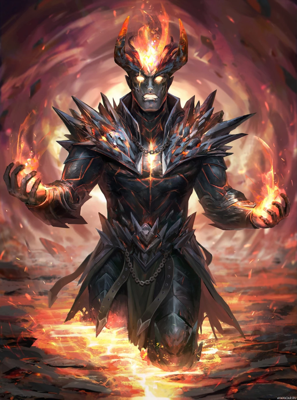 glowing eyes, which are common features in fantasy artwork to suggest evil or malevolent intentions. They are holding their arms outstretched, as if commanding attention or displaying power, and there is