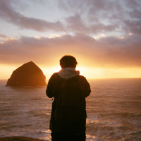 a rocky shore at sunset, with the ocean stretching out to their right. They are facing away from the camera, looking towards
