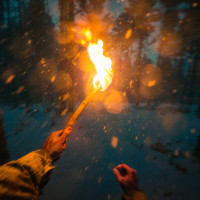 a person in a forest, holding up what appears to be a torch or flaming object. There's snow on the ground and a sense of motion blur around the person, suggesting they might be moving or creating