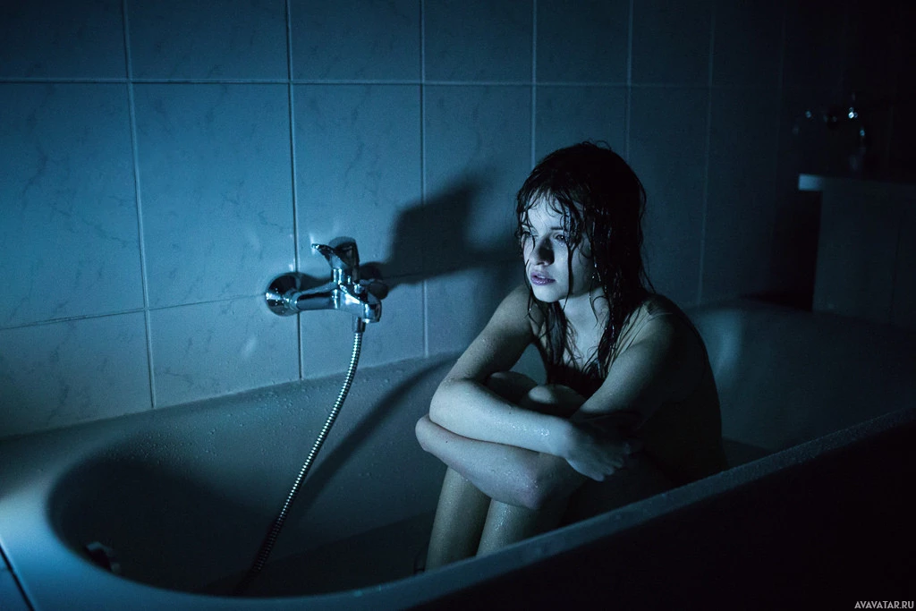 The image shows a woman sitting in a bathtub. She appears to be a brunette with