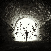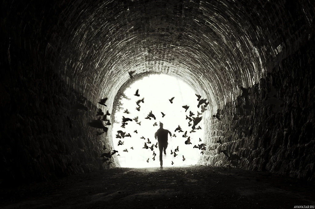 the solitary figure entering the tunnel and the multitude of birds suddenly taking flight. The overall scene conveys a sense of solitude meeting