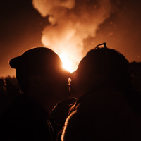 an intimate moment that suggests love and affection. The background is dark, but there appears to be some activity or event taking place beyond the couple, as indicated by what seems like explosions or fireworks in the distance, which adds