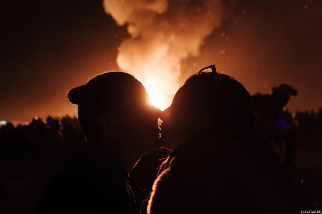 silhouetted figures at night, sharing a kiss. They are facing each other with their heads close together, creating