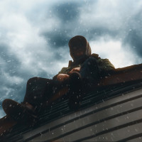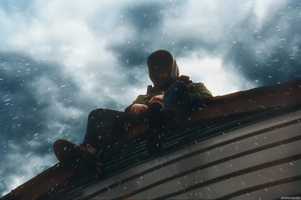 The image shows a person sitting on what appears to be the hood of a car. It's raining, as indicated by the wet roof and the surrounding environment looking dreary and overcast. The man is wearing a hat that could provide some protection from the rain.