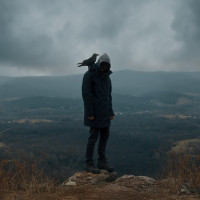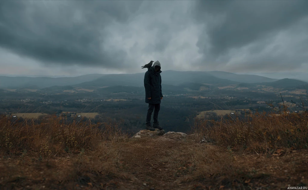 an elevated position, possibly atop a hill or mountain. The person is wearing a dark-colored outfit and has their back to the viewer, looking out over a landscape that includes fields,