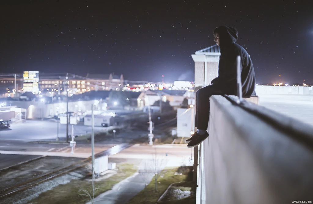 На картинке изображен человек, сидящий ночью на краю крыши. Человек носит темную одежду и, кажется, смотрит вдаль, возможно, наблюдая за городским пейзажем или наблюдая за событием ниже. Фотография имеет зернистую текстуру, которая придает ей несколько художественное или ностальгическое ощущение. Это откровенный снимок, запечатлевший момент одиночества или созерцания в городской среде ночью.
