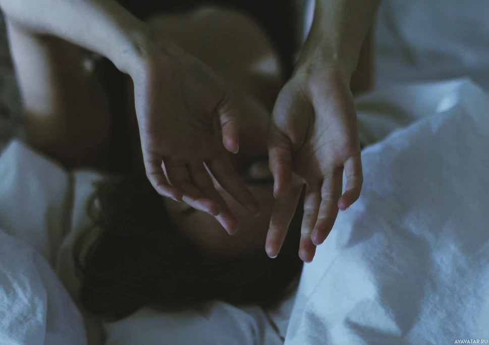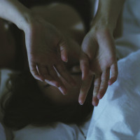 The image shows a person lying on their back with their head resting on someone's lap. Their hands are placed under their cheek, giving the impression that they are holding their face or seeking comfort. The person appears to be in a relaxed and possibly intimate position, suggesting