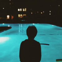 The image shows a silhouette of a child standing by the edge of a swimming pool at night. The lighting is such that it creates a contrast between the shadow of the child and the illuminated environment around the pool, highlighting the form of the individual without any detailed features being visible.