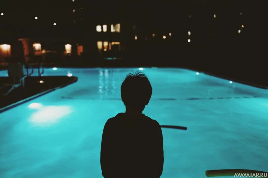 На картинке изображен силуэт ребенка, стоящего ночью у края бассейна. Освещение таково, что создает контраст между тенью ребенка и освещенной окружающей средой вокруг бассейна, выделяя форму человека без каких-либо подробных особенностей.
