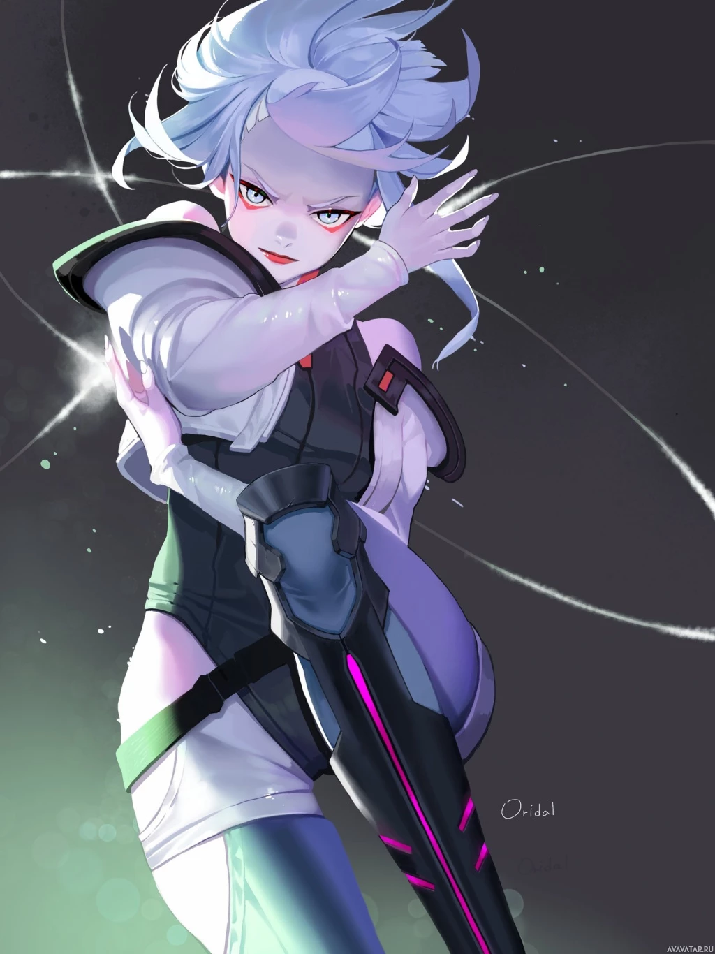 a futuristic armor and is wielding a weapon, which suggests she is a combat-ready character within the context of the game. The artwork has been done in a style typical for video game illustrations, aiming to showcase the character's design and personality.