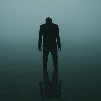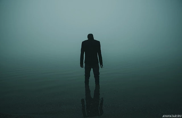 На картинке изображен силуэт человека, стоящего на краю того, что кажется водой. Он смотрит вдаль со скрещенными руками, предлагая созерцание или самоанализ. Общая атмосфера несколько жуткая и мрачная из-за туманной среды и одинокой фигуры в центре изображения.