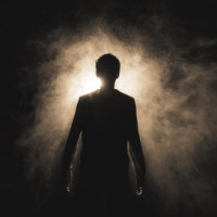 The image depicts a silhouette of a person standing with their arms outstretched, as if they are in motion or performing. They appear to be surrounded by smoke or vapor that emanates from beneath them, giving the impression of a dramatic or intense performance. The background is quite dark, emphasizing the silhouette and the light emitting from it.