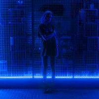 a blue neon light backdrop. The individual is wearing