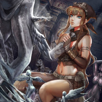 a fantasy setting, sitting on a rock with what appears to be a sword or staff resting beside her. Her attire suggests she may have a role as a warrior or adventurer in this