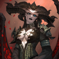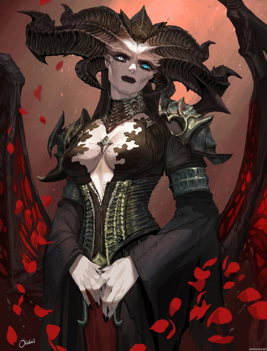The image depicts a character that appears to be Lilith, a demon from the "Diablo"