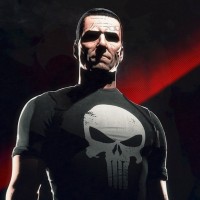 The image depicts a character dressed in a Punisher outfit, which is recognizable by its iconic skull and