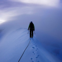 tracks in the snow indicating that someone has recently passed this way, and the skies appear to be cloudy with hints of blue peeking through. It seems to be a challenging